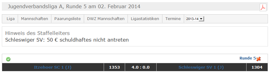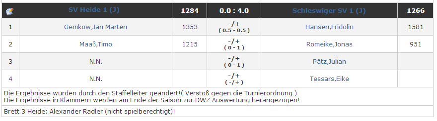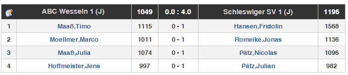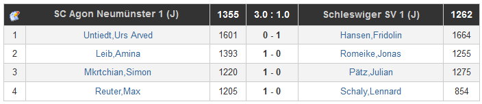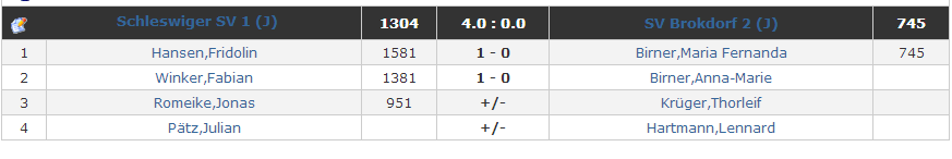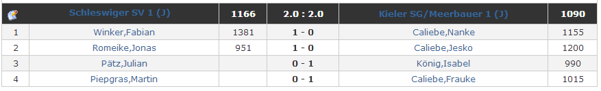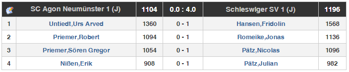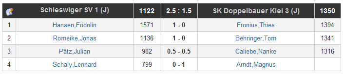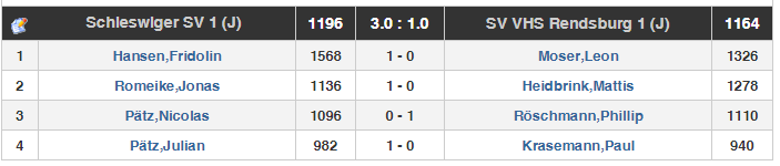 "Beim Spiel Schleswig gegen Lübeck III war es spannend. Nachdem es beim ersten Spiel 2-2 (B.W. 5-5) stand, gab es beim Blitzen das gleiche Ergebnis. Beim zweiten mal Blitzen gab es dann aber ein klares 4-0 für Lübeck."